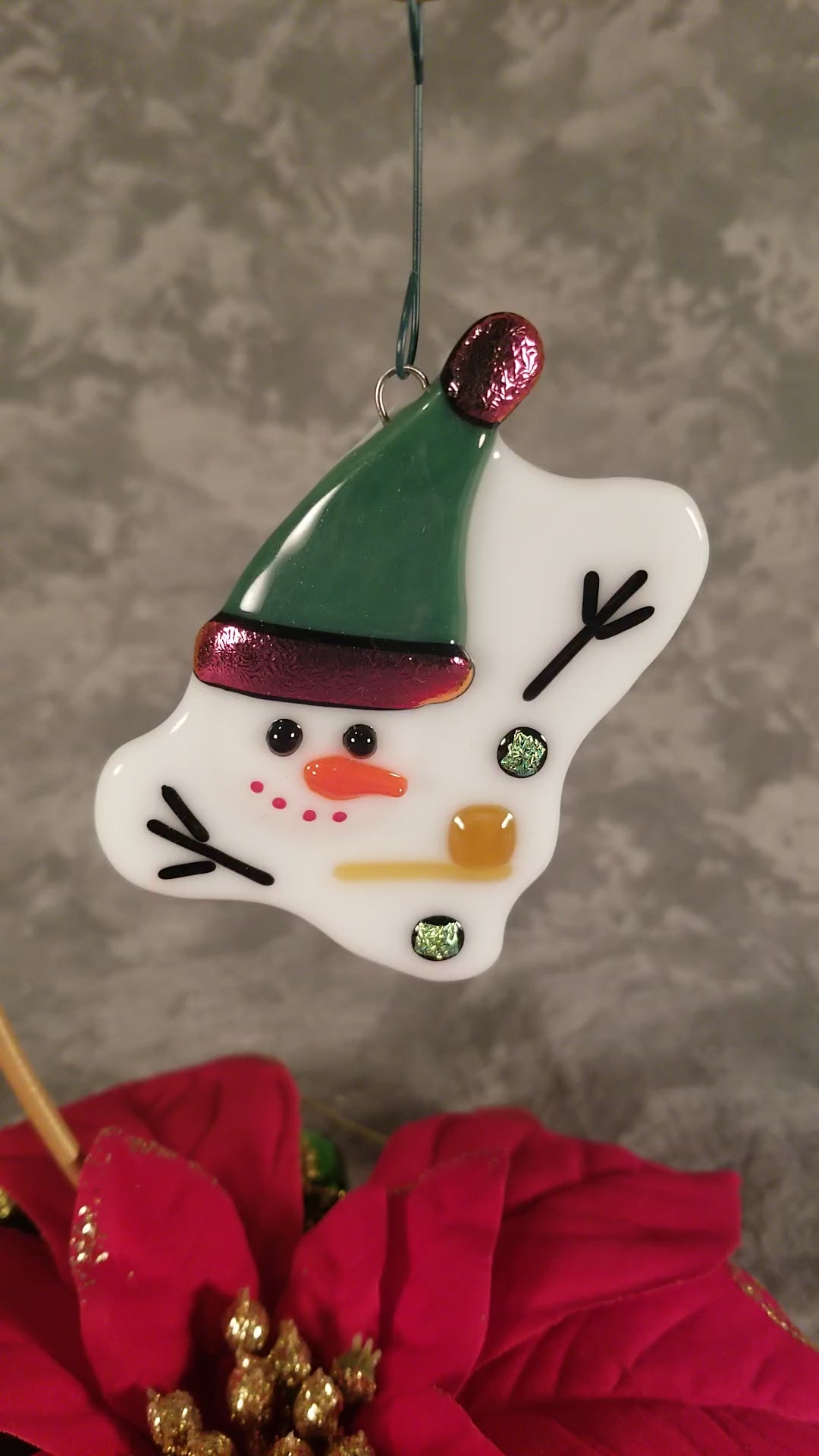 Melted Snowman glass ornament with green hat with dichroic red/green trim. His is melting into a snow puddle. His pipe, arms and dichroic glass buttons are in disarray from melting, but he still has a festive smile!
